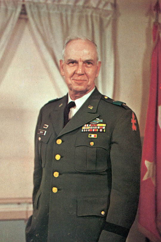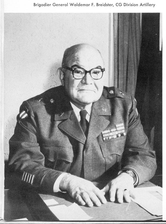 | Maj. Gen. Waldemar Fritz Breidster | 1 October 1956 to 28 June 1960 | Born 19 Jun. ‘00 at Milwaukee, WI; married, father of two; graduated Riverside H. S. in ‘17; joined Army as Pvt. in ‘18; attended U. of Wis. until his appointment to USMA at West Point in Jun. ‘19, lettered in Black Knights football 4 years, All-American guard ‘21 & ’22; selected First Captain in ‘23; commissioned 2d Lt. in ‘23; resigned his Regular Army commission in Apr. ‘25 to enter private business and accepted commission as 1st Lt. in Reserve; commissioned Capt. in Wisconsin National Guard and assumed command of Btry. D, 121ST FA Regt. in Jan. ‘27; promoted Maj. and battalion commander in ‘31; promoted Lt. Col. and XO of 121ST FA Regt. in ‘36; Col. and Cdr. of 121ST FA Regt. in Aug. ‘40; assumed command of 173D FA Regt. ca. 16 Jan. ‘42; he was sent to India in Aug. ‘43 where his assignments included chief FA liaison officer to Chinese army in India and chief of staff with Northern Combat Area Command (NCAC), under Gen. Joseph ‘Vinegar Joe’ Stilwell; sailed from India for U.S. 1 Dec. ‘45; Brig. Gen. and Cdr. of 32D Div. Arty. Mar. ‘47; assumed command of 32D Div. 1 Oct. ‘56; retired 1 Jul. ‘60; awards include Legion of Merit w/OLC, Chinese Yun Wei (Cloud Banner), Chinese Kua Chang (Hero of the Nation); passed away 2 Apr. ‘82 at Fox Point, WI. |