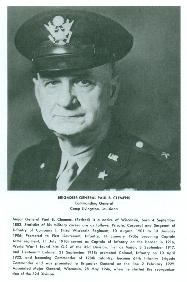 | Maj. Gen. Paul Bernard Clemens | 28 May 1946 to 1947 | Born 4 Sep. ‘82 at Superior, WI; Pvt., Cpl., & Sgt. in Co. I, 3D Wis. Inf., Wisconsin National Guard, 10 Aug. ‘01 to 13 Jan. ‘06; 1st Lt., infantry, on 14 Jan. ‘06; Capt. on 11 Jul. ‘10; Cdr. of Sup. Co., 3D Wis. Inf. during Mexican Border Crisis in ‘16; Maj. on 3 Sep. ‘17; G-2 of Div. during WWI; Lt. Col. on 21 Sep. ‘18; earned Distinguished Service Medal, Chevalier de la Légion d’Honneur, Croix de Guerre, and Div. Citation during WWI; Lt. Col. & XO, HQ, 128TH Inf., when it received Fed. Recognition during post-WWI reorganization on 16 Apr. ‘21; Col. & Cdr. of 128TH Inf., 32D Div., on 10 Apr. ‘22; Brig. Gen. & Cdr. of 64TH Inf. Bde., 32D Div., on 2 Feb. ‘29; Brig. Gen. and Cdr. of HQ, 64TH Inf. Bde., at Baraboo, WI on 15 Oct. ‘40; transferred from Div. and assigned director of security and intelligence for 7TH Service Command at Omaha, NE ca. ‘41; assumed command of 32D Div. on 28 May ‘46; passed away 31 Oct. ‘60. |