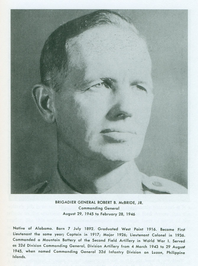 | Brig. Gen. Robert B. McBride, Jr. | 29 August 1945 to 28 February 1946 (inactivation) | Born 7 Jul. ‘92 at AL; graduated USMA at West Point in ‘16; 1st Lt. in ‘16; Capt. in ‘17; commanded a mountain battery of 2D FA during WWI; Maj. in ‘26; Lt. Col. in ‘36; CG of 32D Div. Arty. 4 Mar. ‘43 to 29 Aug. ‘45; assumed command of 32D Div. on 29 Aug. ‘45. |