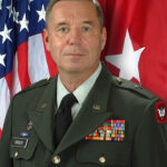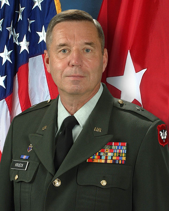 | Brig. Gen. James A. Krueck | 15 October 2000-October 2006 | Born 16 May ‘48 at Sheboygan, WI; graduated Sun Prairie H.S., earned BA degree in economics from U. of Wis.-Milwaukee and MA degree in Strategic Studies from U.S. Army War College; enlisted in the 32D Inf. Div., WIARNG, in ‘66 and reached the rank of S. Sgt. before being appointed as warrant officer in ’73; graduated Wisconsin Military Academy and commissioned 2d Lt., armor, in ’78; held a variety of command and staff assignments in HHC, 32D Inf. Bde.; 1ST Bn., 632D AR; 1ST Bn., 121ST FA; 13TH Evac. Hosp. and 64TH Troop Command; served as Director of Personnel and Administration, Director of Human Resources, Director of Logistics and Chief of Staff at State Headquarters; deployed to Kuwait in Jul. ‘05 as Cdr. of 32D Sep. Inf. Bde. (Light) and Dep. Cdr. of 377TH Theater Support Command in support of Operation Iraqi Freedom; this was the 32D Bde.’s first deployment into a combat theater since WWII; although the 32D Bde. did not mobilize as a whole, all units deployed in support of OIF or OEF between Jun. ‘04 and Feb. ’07; commanded the WIARNG from Nov. ‘06 until his retirement in Feb. ’08; awards include Distinguished Service Medal, Legion of Merit Medal, Bronze Star Medal and three Meritorious Service Medals. |