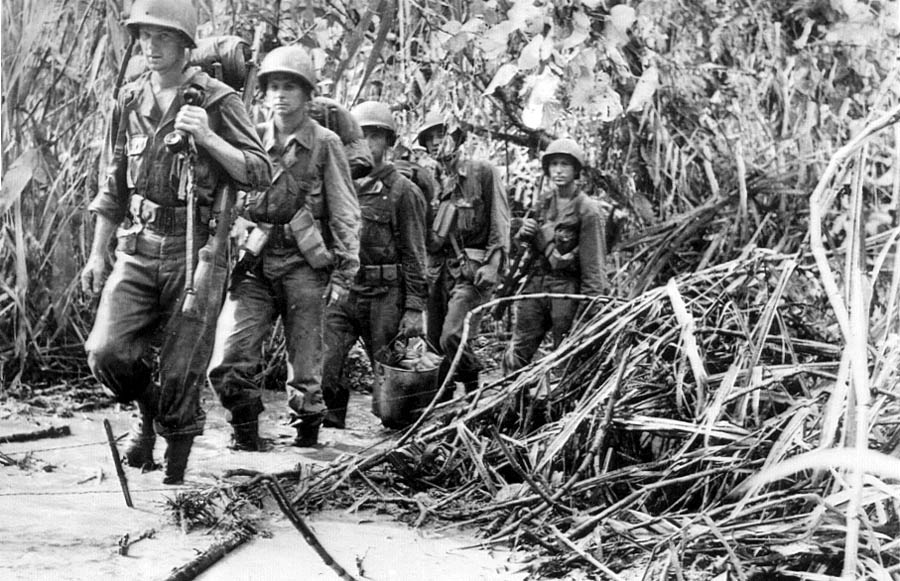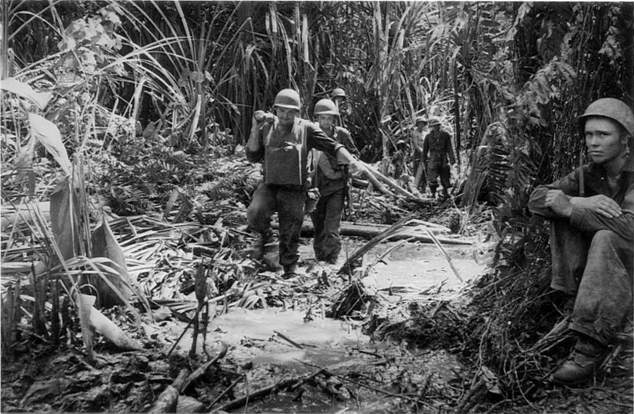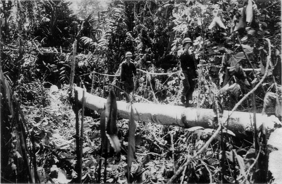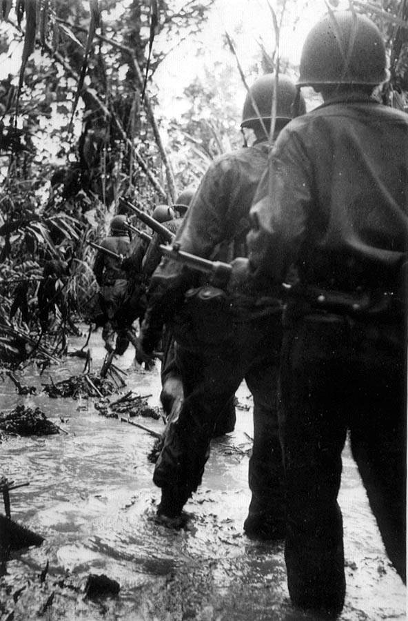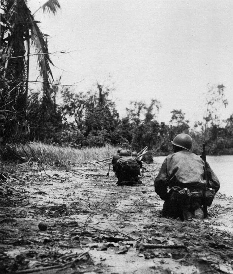“The village in hand, the next step was to cross Konombi Creek, a tidal stream about forty feet across. A suspension bridge over the creek was badly damaged, and attempts on 9 January to cross it were met by fire from hidden emplacements on the opposite shore. Colonel Grose’s plan was therefore to flank the enemy positions by sending an element of Company C across the creek that night in the two available boats. The company commander, 1st Lieutenant Tally D. Fulmer, was put in charge of the crossing. “The troops embarked at 0240 on the 10th. The swift current started taking the boats out to sea, but the danger was perceived in time, and the men reached shore before any harm was done.